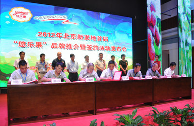 2012年8月28日上午,首屆“北京悠樂果品牌推介會”在北京新發地農產品批發市場會展中心舉行。圖為“悠樂果”品牌所有人北京旺達玉柱果品有限公司總經理徐柱(前排右四)與經銷商簽約儀式。