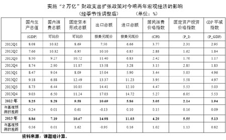 模擬的結果表明:在當前外部經濟環境下(如基準預測所假定),實施追加“2萬億”財政支出擴張計劃的作用有限。2012年的GDP增長率上升至8.25%,僅較基準預測提高了0.24個百分點;2013年為8.86%,較基準預測提高0.55個百分點;而由此帶動的信貸及貨幣擴張,不僅會大幅提升通貨膨脹的風險,并且將進一步惡化原已失衡的經濟結構。2012年CPI將上漲3.05%,2013年將上漲4.29%,分別比基準預測的結果提高0.15和1.02個百分點;固定資本形成總額占GDP的比重今明兩年將分別提高0.1和0.6個百分點,而居民消費占GDP比重將分別下降0.1和0.2個百分點。
