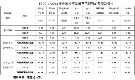1、在各種預測及模擬情況下,經濟增長率的最低預測值為7.5%。說明中國經濟增長“降中趨穩”的態勢正在確立。盡管由于歐元區經濟衰退的沖擊,將增大短期內中國經濟增長率進一步下滑的壓力,但是,適當的宏觀調控政策將使中國經濟不會出現大幅度下滑。7.5%的增速是近期可以實現的低線。另一方面,即使為提高增長而出臺“2萬億”的投資刺激計劃,經濟增速也僅能拉升到8.25%(2012年)和8.86%(2013年)的水平,高低區間不過0.5-0.6個百分點。