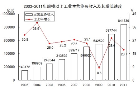 工業實力不斷增強。2011年,規模以上工業主營業務收入達到84.2萬億元[1],比2002年增長6.7倍;資產總計達到67.6萬億元,增長3.6倍;利潤總額達到6.1萬億元,增長9.6倍。主要工業產品規模擴張迅速。據初步統計,2011年,微型計算機產量達到3.2億臺,比2002年增長20.9倍;移動通信手持機11.3億臺,增長8.3倍;集成電路720億塊,增長6.5倍;家用電冰箱8699萬臺,增長4.4倍;房間空氣調節器1.4億臺,增長3.4倍;彩色電視機1.2億臺,增長1.4倍;粗鋼6.8億噸,增長2.8倍;生鐵6.3億噸,增長2.7倍;水泥20.9億噸,增長1.9倍;平板玻璃7.4億重量箱,增長2.1倍;紗2900萬噸,增長2.4倍;布837億米,增長1.6倍;汽車1842萬輛,增長4.7倍;發電量達到4.7萬億千瓦小時,增長1.8倍。