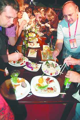 俄羅斯游客在綏芬河中俄美食文化節上品嘗中國美食。 |
