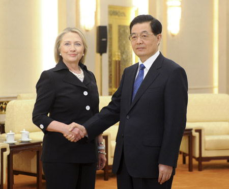 國家主席胡錦濤5日上午在人民大會堂會見了美國國務卿希拉里·克林頓。 胡錦濤表示,保持中美經貿關系穩定發展對兩國乃至世界經濟復蘇和增長都有重要影響。希望雙方充分發揮互補優勢,努力挖掘合作潛力,積極推進貿易和投資一攬子合作,不斷提升雙邊經貿合作的質量和水平。同時,妥善處理雙邊經貿關系中存在的摩擦和分歧,避免經貿問題政治化。希望美方堅決抵制貿易保護主義,放寬高技術產品對華出口限制,為中國企業赴美投資提供公平競爭環境。