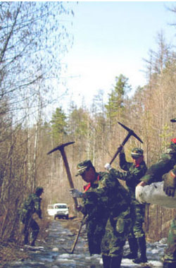 正值盛夏,林區的天氣陰雨不斷,前往黑龍江省大興安嶺地區寶興溝礦區的山路由于泥濘而更加難行。工作人員提醒記者要換上防滑防水的雨鞋,還要提防野外的蚊子!斑@些蚊子都屬野戰部隊,很厲害!庇泄ぷ魅藛T開玩笑說。