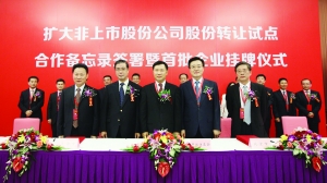 在掛牌儀式上,中國證監會副主席姚剛與北京市常務副市長李士祥、天津市常務副市長崔津渡、上海市副市長屠光紹和湖北省副省長趙斌分別簽署合作備忘錄,來自北京中關村、天津濱海、上海張江和武漢東湖四家高新技術園區的8家公司負責人為掛牌交易共同敲鐘。