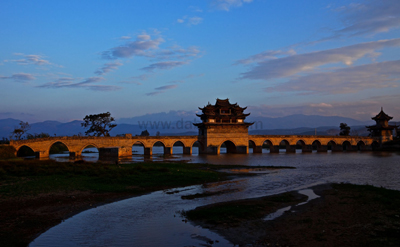 龍橋位于建水城西3公里的瀘江與塌沖河上,因兩河蜿蜒如龍,故而得名,俗稱“十七孔橋”,是一座三閣十七孔大石拱橋,是云南省規模最大、藝術價值最高的一座多孔連拱橋,已列入中國造橋史冊。1965年我國著名橋梁專家茅以升前來考察,將其列為全國大型古橋之一,遂被定為云南省重點文物保護單位。