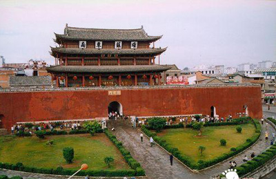 朝陽樓原名叫迎暉門,亦稱東門樓,始建于明朝洪武二十二年(1389年),比北京天安門早建28年,至今已有600多年的歷史,是祖國邊陲古老軍事重鎮的象征。600多年前,明軍平定云南后,設臨安衛,筑臨安城,并在四座城門上各建樓三層,東門叫迎暉門(即朝陽樓),南西北三城均毀于戰火,唯東門朝陽樓完好無損。朝陽樓樓層高24米,為三重檐歇山頂。檐角飛翹、畫棟雕梁、巍峨挺拔、氣勢雄偉。三樓屋檐下懸掛著“飛霞流云”、“雄鎮東南”的巨字匾額,是唯一幸存的清代四大榜書之一。