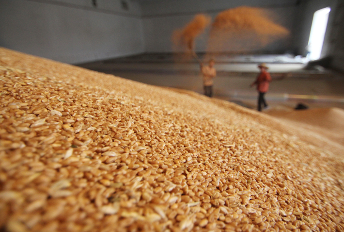 在中儲糧山東臨沂直屬庫郯城縣分庫,工人在整理剛入庫的夏糧。新華社記者 張春雷 攝 |