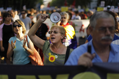 由于西班牙陷入經濟衰退,西班牙政府正面對越來越多的街頭抗議,9月22日,在西班牙首都馬德里,民眾抗議西班牙政府的經濟緊縮措施。一些示威者還舉著“無工作,無房子,無畏懼”的標語參加游行。西班牙政府表示,將對整個經濟進行綜合權衡,避免進一步削減公共開支。