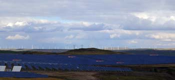 一座座亭亭玉立的風力發電機,一排排熠熠生輝的太陽能光伏電池板,構成塞北高原一道奇異的風景。記者 杜躍進/攝 |