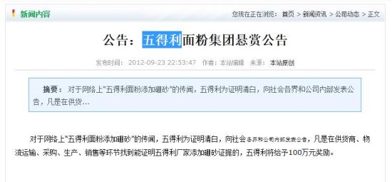 五得利集團今日在官方網站上發布公告稱,對于網絡上“五得利面粉添加硼砂”的傳聞,五得利為證明清白,向社會各界和公司內部發表公告,凡是在供貨商、物流運輸、采購、生產、銷售等環節找到能證明五得利廠家添加硼砂證據的,五得利將給予100萬元獎勵。