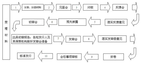 按照依法行政、公開透明、集體決策、分工制衡的要求,首次公開發行股票(以下簡稱首發)的審核工作流程分為受理、見面會、問核、反饋會、預先披露、初審會、發審會、封卷、會后事項、核準發行等主要環節,分別由不同處室負責,相互配合、相互制約。對每一個發行人的審核決定均通過會議以集體討論的方式提出意見,避免個人決斷。