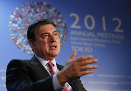 國際貨幣基金組織(IMF)10日在東京發布《全球金融穩定報告》,稱全球金融市場的首要風險仍在歐元區,呼吁歐元區等發達經濟體政策制定者加快行動速度,采取更多措施穩定金融市場。 IMF貨幣與資本市場部主任何塞·比尼亞爾斯警告說,如果歐洲的銀行系統繼續承受壓力,到2013年底,受銀行去杠桿化影響,主要歐洲銀行的整體資產可能縮水2.8萬億美元,對歐元區“邊緣國”的融資將減少9%;而按照更糟糕的情景假設推算,歐洲銀行資產最多可能縮水4.5萬億美元。 圖為比尼亞爾斯在報告發布會現場。
