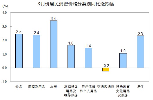 9月份,全國居民消費價格總水平環比上漲0.3%。其中,城市上漲0.3%,農村上漲0.4%;食品價格上漲0.2%,非食品價格上漲0.4%;消費品價格上漲0.4%,服務項目價格上漲0.3%。