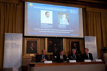 10月15日,在瑞典首都斯德哥爾摩,諾貝爾經濟學獎揭曉儀式現場的幻燈片展示獲獎者、美國經濟學家阿爾文·羅思(左)和勞埃德·沙普利的照片。 當天,瑞典皇家科學院宣布將2012年諾貝爾經濟學獎授予美國經濟學家阿爾文·羅思和勞埃德·沙普利。