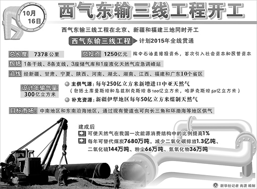 10月16日,西氣東輸三線工程西段(新疆霍爾果斯—寧夏中衛)和東段(江西吉安—福建福州)已經分別開焊、開鉆,預計分別于2013年粘合,2014年建成投產。