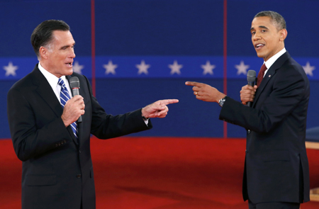10月16日,在美國紐約州霍夫斯特拉大學,美國總統奧巴馬(右)與共和黨總統候選人羅姆尼進行辯論。 第二場辯論采取“市民大會”的形式,由美國知名民調機構蓋洛普公司遴選出80余名未決定投票意向的選民參加,在現場向總統候選人提出自己關心的問題,內容可涵蓋內外政策。 雙方在現場再度打起所謂的“中國牌”。羅姆尼譴責奧巴馬未將中國定義為匯率操縱國,并承諾自己將向中國施壓,讓更多的工作崗位回流美國,而奧巴馬則抨擊羅姆尼“暗度陳倉”,其投資的一些公司都是將業務外包到中國、導致美國本土崗位流失的先頭部隊。