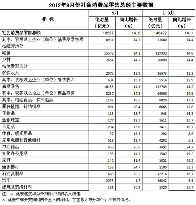 2012年9月份,社會消費品零售總額18227億元,同比名義增長14.2%(扣除價格因素實際增長13.2%,以下除特殊說明外均為名義增長)。其中,限額以上企業(單位)消費品零售額8931億元,增長14.7%。1-9月份,社會消費品零售總額149422億元,同比名義增長14.1%(扣除價格因素實際增長11.6%)。從環比看,9月份社會消費品零售總額增長1.46%。