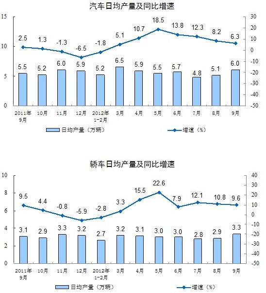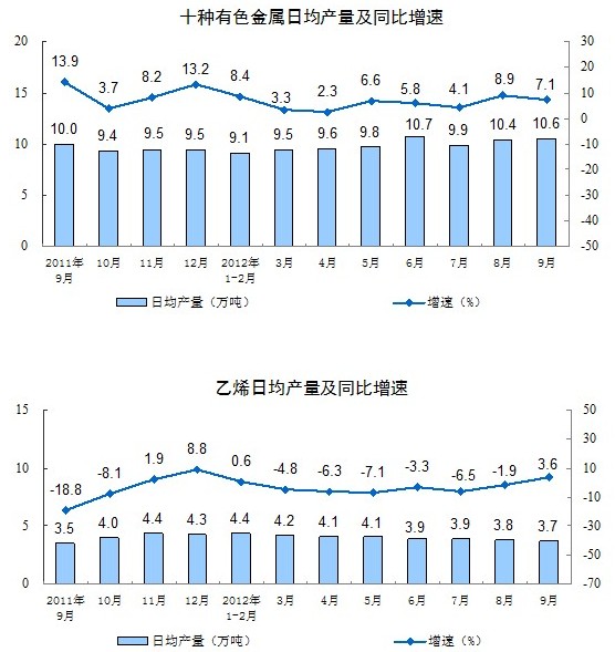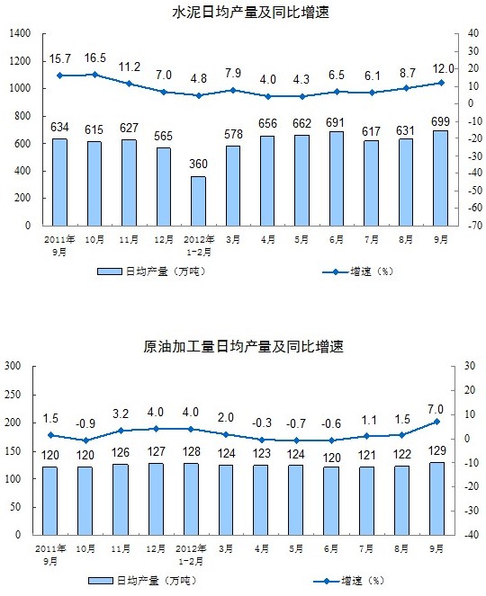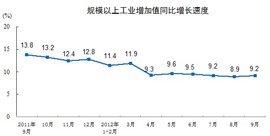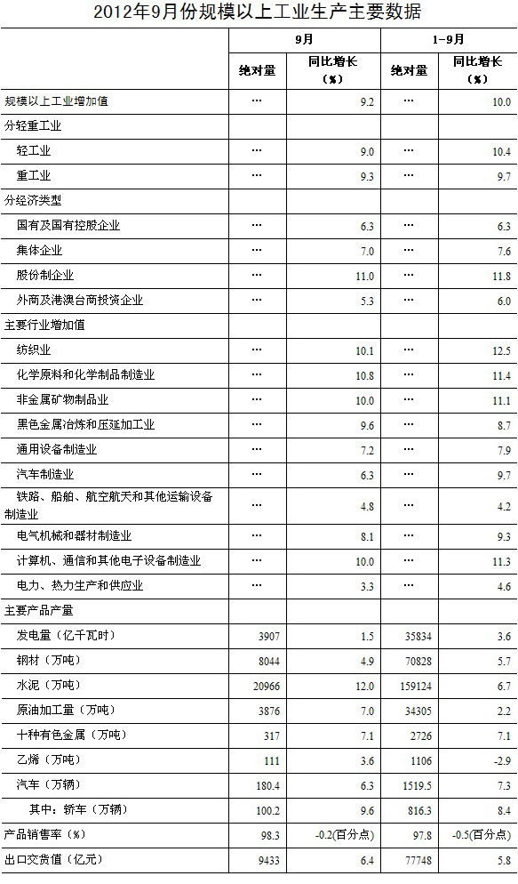 2012年9月份,規模以上工業增加值同比實際增長9.2%(以下增加值增速均為扣除價格因素的實際增長率),比8月份加快0.3個百分點。從環比看,9月份,規模以上工業增加值比上月增長0.79%。1-9月份,規模以上工業增加值同比增長10.0%。