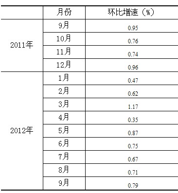 根據季節調整模型自動修正結果,對2011年9月份至2012年8月份的規模以上工業增加值環比增速進行修訂。修訂結果及2012年9月份環比數據如下: