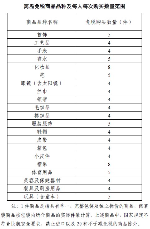 (三)將離島旅客每人每次免稅購物限額調整為人民幣8000元,即單價8000元以內(含8000元)的免稅商品,每人每次累計購買金額不得超過8000元,同時適當提高購買免稅商品數量范圍(詳見附件)。