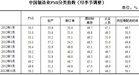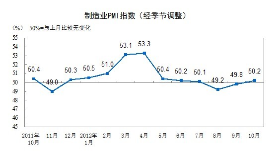 2012年10月,中國制造業采購經理指數(PMI)為50.2%,比上月上升0.4個百分點,重新回到臨界點之上。