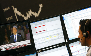 當地時間7日,法蘭克福交易所中,一名股票交易員正在觀看美國總統奧巴馬成功連任后進行演說的電視直播。(路透) |