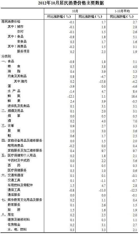 2012年10月份,全國居民消費價格總水平同比上漲1.7%(創33個月以來新低)。其中,城市上漲1.8%,農村上漲1.5%;食品價格上漲1.8%,非食品價格上漲1.7%;消費品價格上漲1.5%,服務項目價格上漲2.3%。1-10月平均,全國居民消費價格總水平比去年同期上漲2.7%。