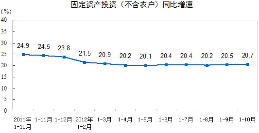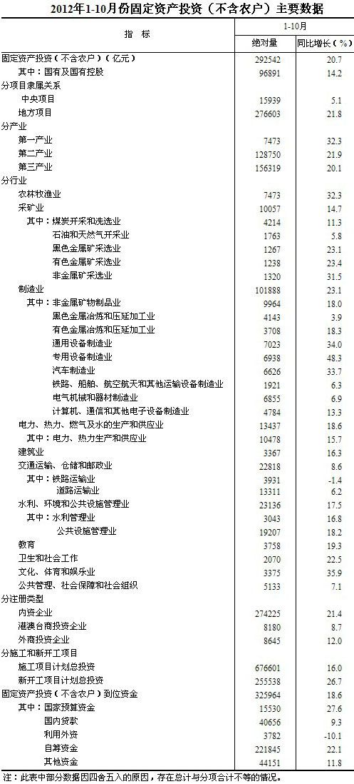 2012年1-10月份,全國固定資產投資(不含農戶)292542億元,同比名義增長20.7%,增速比1-9月份加快0.2個百分點。從環比看,10月份固定資產投資(不含農戶)增長1.94%。