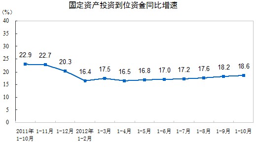 從到位資金情況看,1-10月份,到位資金325964億元,同比增長18.6%,增速比1-9月份提高0.4個百分點。其中,國家預算資金增長27.6%,增速提高0.2個百分點;國內貸款增長9.3%,提高0.5個百分點;自籌資金增長22.1%,提高0.2個百分點;利用外資下降10.1%,降幅比1-9月份擴大3.8個百分點;其他資金增長11.8%,提高1.5個百分點。