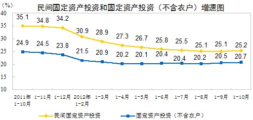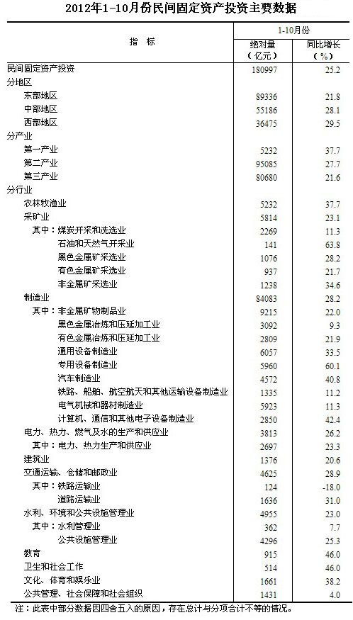 2012年1-10月份,全國民間固定資產投資180997億元,同比名義增長25.2%,增速比1-9月份加快0.1個百分點。民間固定資產投資占固定資產投資的比重為61.9%,比1-9月份下降0.1個百分點。