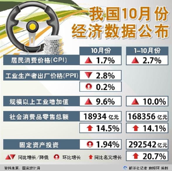 國家統計局數據顯示,10月份,消費增速為14.5%,較9月份回升0.3個百分點;規模以上工業增加值同比增長9.6%,比9月份加快0.4個百分點;而前10個月固定資產投資累計增速為20.7%,較1-9月份加快0.2個百分點。