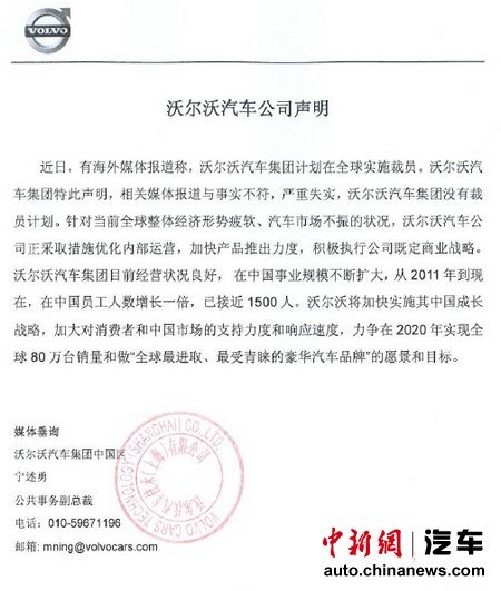 日前據瑞典《每日工業報》報道,為縮減開支,吉利汽車旗下沃爾沃轎車公司正計劃進一步裁員;此次裁員計劃將波及公司2.2萬名全職員工和3500名外聘咨詢師。報道中稱,此前該公司已經在英國、比利時和巴西等多國工廠宣布多項裁員計劃。消息傳出后,沃爾沃汽車集團向中新網汽車頻道發來聲明,否認其有裁員打算。沃爾沃汽車集團中國區公共事務副總裁寧述勇在聲明中稱,有關沃爾沃計劃在全球實施裁員的相關媒體報道與事實不符,沃爾沃汽車集團沒有裁員計劃。
