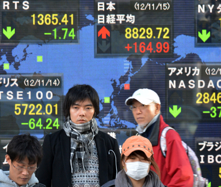 11月15日,東京股市高開高走,收盤時日經225種股票平均價格指數比前一個交易日大漲1.90%,報8829.72點。日本首相野田佳彥14日宣布將于16日解散眾議院。若大選后誕生以自民黨為中心的新政權,預計新政府將采取激進的貨幣寬松政策及財政支出來刺激經濟復蘇,受此提振,當日早盤日經股指上漲0.96%! 圖為15日,在日本首都東京,行人經過電子股指顯示牌。