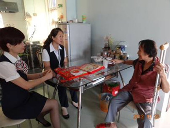 在珠海市著名文學創作家葉昌的遺孀、獨居老人韓秀坤家中,新華保險理賠關懷公益志愿服務會的志愿者與老人促膝談心 |