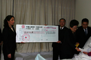 客戶尚先生于2008年10月在新華保險先后投保了福如東海A款終身壽險,附加提前給付重大疾病保險A款以及吉利相伴A款兩全保險。今年3月,尚先生被確診為結腸癌晚期,病情危重隨時危及生命。得知這一情況后,新華保險積極組織理賠工作,迅速啟動理賠綠色通道。3月23日晚,全國勞動模范、新華保險功勛總監、海淀聯合營業區總經理金愛麗親自將提前給付的福如東海A款終身壽險,附加提前給付重大疾病保險A款100萬元大額理賠金送到正在接受治療的尚先生手中。