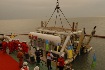 在西氣東輸二線深圳-香港支線海底管道項目施工現場,由管道局與國內知名科研單位共同研發的“神龍號”大口徑后挖溝機浮出水面,標志著深圳-香港海底管道后挖溝工程順利竣工。記者