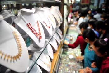 圖為顧客在廣西梧州市寶石城選購人工寶石飾物。黃孝邦/攝 |