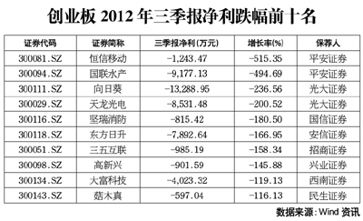 以2012年以來上市、2012年三季報凈利潤出現下滑的27家創業板上市公司為例,Wind統計顯示,上述27家企業中,國信證券和平安證券保薦的項目數量均為6家,國泰君安、國金證券各有兩家,中信證券、東吳證券、廣發證券等也在內。一位注冊會計師告訴《經濟參考報》記者,中小板、創業板的一些公司抗風險能力比較弱,在上市前期,為了保證通過,可能會使用會計調節的手段,這樣會透支未來的利潤,在整個宏觀經濟不好的情況下,出現業績變臉也在情理之中。