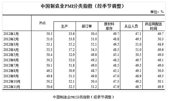 2012年11月,中國制造業采購經理指數(PMI)為50.6%,比上月上升0.4個百分點。