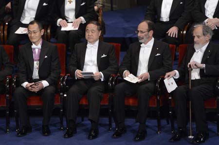12月10日,在瑞典首都斯德哥爾摩音樂廳,2012年諾貝爾文學獎獲得者、中國作家莫言(左二)出席2012年諾貝爾獎頒獎儀式。