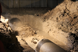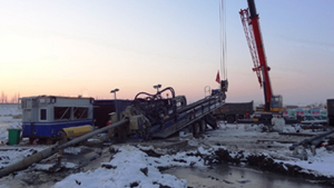 泥漿是定向穿越中的關鍵因素,被視為定向鉆的“血液”。圖為在泥漿中回拖預置管線入洞。 |