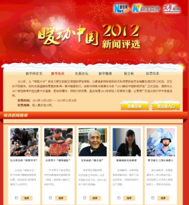 末日預言煙消云散,在這個“極寒”的冬季,有一些新聞“主角”用他們自己的故事,憑借“善”的本能向周圍散發溫暖、傳遞愛意。由新華網新華微博主辦的“2012十大暖動中國新聞評選”活動經過10天的網友投票,結果于今日揭曉。
