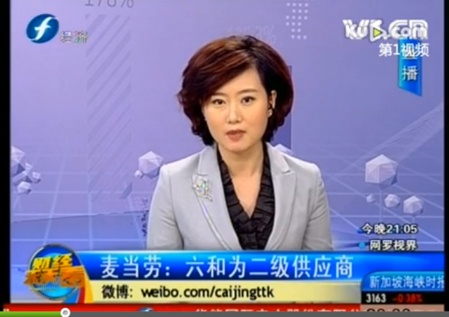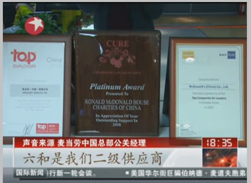 記者經過仔細查找,發現了近日東方衛視和福建東南衛視的新聞視頻。視頻內接受電視臺記者采訪的麥當勞中國總部公關經理給出了答案:六和是我們(麥當勞)的二級供應商。