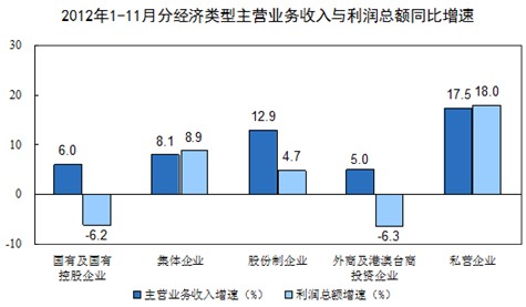 1-11月份在規模以上工業企業中,國有及國有控股企業實現利潤12585億元,同比下降6.2%;集體企業實現利潤711億元,同比增長8.9%;股份制企業實現利潤27304億元,同比增長4.7%;外商及港澳臺商投資企業實現利潤10731億元,同比下降6.3%;私營企業實現利潤14946億元,同比增長18%。