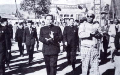 1956年,周恩來總理與緬甸總理吳巴瑞共同出席在芒市召開的中緬邊民聯歡大會。