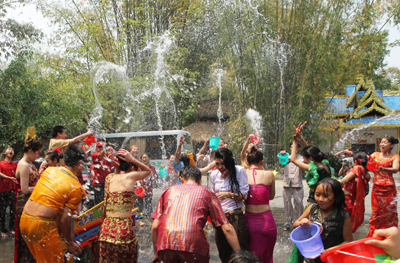 潑水節,德宏傣語稱“擺爽南”,德昂語稱“拱拍”,阿昌人稱“澆花節”。它是傣歷新年,也是佛教節日,即浴佛節或佛誕節,是從印度的“灑紅節”和到圣河沐浴的習俗衍變而來。