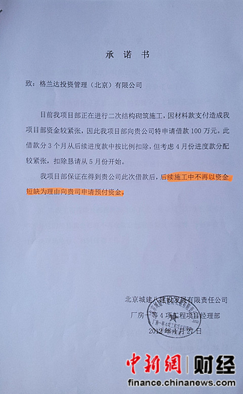 針對由于后面工程有利潤所以甲方不想讓北京城建八做的說法,康保中國投資總監張立對中新網財經頻道說:“真正的原因是北京城建八的項目部沒有能力(掛靠公司)、信譽和資金完成后續項目,北京城建八兩次向格蘭達投資借款:第一次為100萬元;第二次為200萬元。第一次借款格蘭達投資借了;第二次由于工期延誤,格蘭達投資同意借款,但前提條件是請乙方承諾完工時間和工地移交時間以及?顚S,由于城建八無法承諾,所以雙方未就此事達成一致。后續工程由于乙方沒有施工組織能力和沒有資金購買材料而無法施工。從9月份起,現場施工人員嚴重不足,現場基本沒有管理,在格蘭達投資多次催促下,現場還沒有任何改善,這是工程沒法完成的真實原因。關于材料備料款根據雙方約定格蘭達投資不需要支付乙方材料備料款,另外格蘭達投資已經足額支付了安全文明施工費!