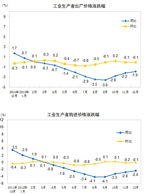 2012年12月份,全國工業生產者出廠價格同比下降1.9%,環比下降0.1%。工業生產者購進價格同比下降2.4%,環比下降0.1%。2012年,工業生產者出廠價格比上年下降1.7%,工業生產者購進價格比上年下降1.8%。