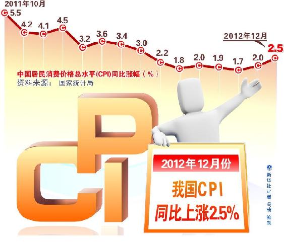 國家統計局今日公布數據顯示,12月份居民消費價格指數(CPI)同比上升2.5%,其中,食品價格上漲4.2%。