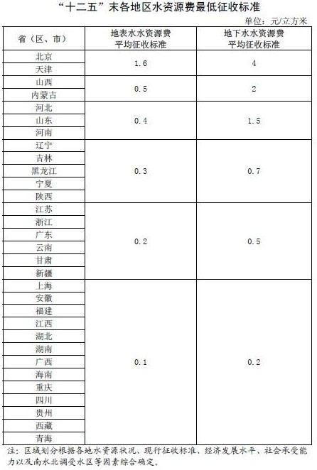 根據《通知》規定的“十二五”末各地區水資源費最低征收標準,北京和天津的地表水水資源管理費平均征收標準為1.6元/立方米,地下水水資源費平均征收標準為4元/立方米,而上海和青海、西藏等省份同列最低費用征收標準范疇,地表水和地下水水資源費平均征收標準分別為0.1元/立方米和0.2元/立方米。
